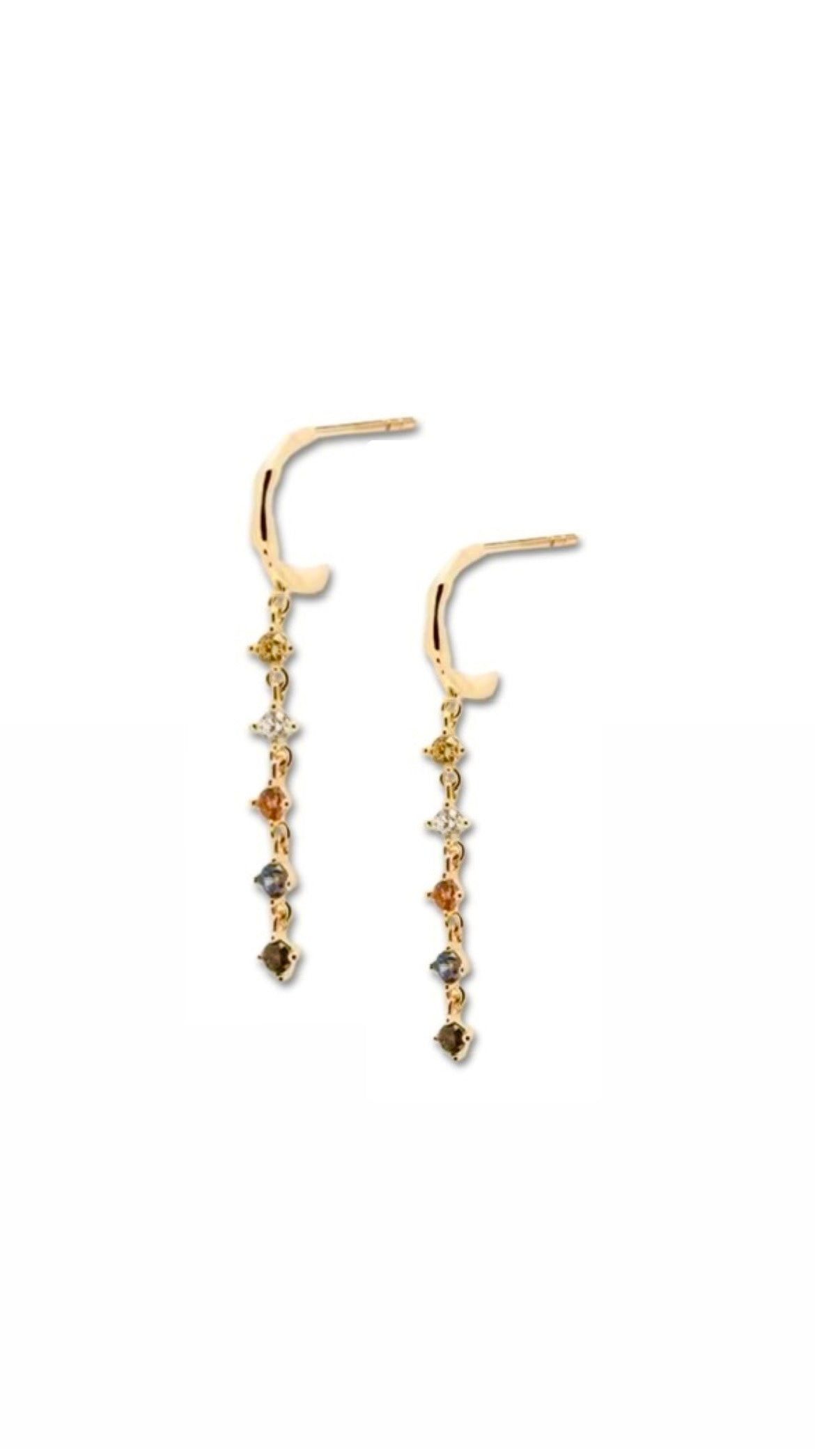 Pendientes de aro de 11 mm, unidos a cadena colgante compuesta de cinco diamantes de color, de una largura aproximada de 28 mm.